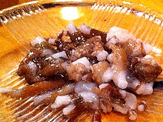 私の中での定番『モツの刺身の盛り合わせ(\1,100)』